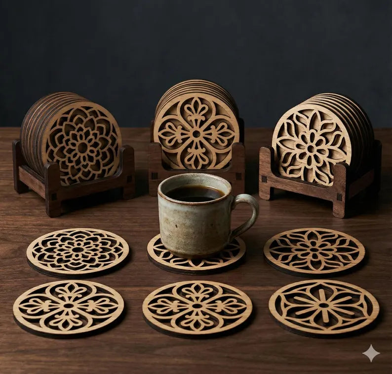 Sa preciznim, laserski sečenim motivima inspirisanim mandalama, ovi podmetači pretvaraju običnu kafu ili čaj u mali ritual.