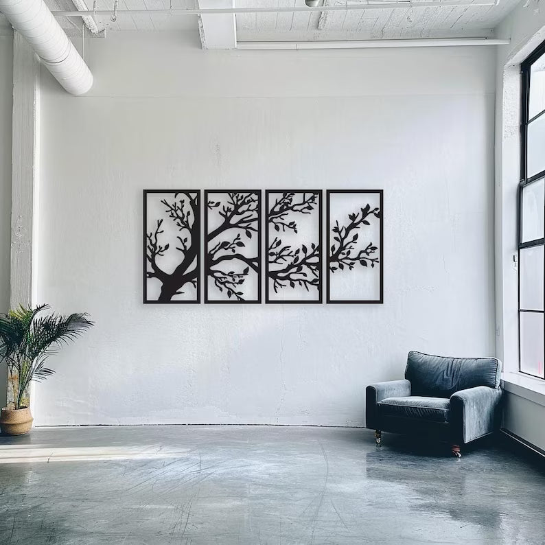Ovaj moderan i minimalistički dizajn savršeno se uklapa u enterijere poput dnevnih soba, spavaćih soba, kancelarija, hodnika ili poslovnih prostora. Četiri odvojena dela zajedno čine prelepu siluetu granja, stvarajući upečatljiv vizuelni efekat na svakom zidu.