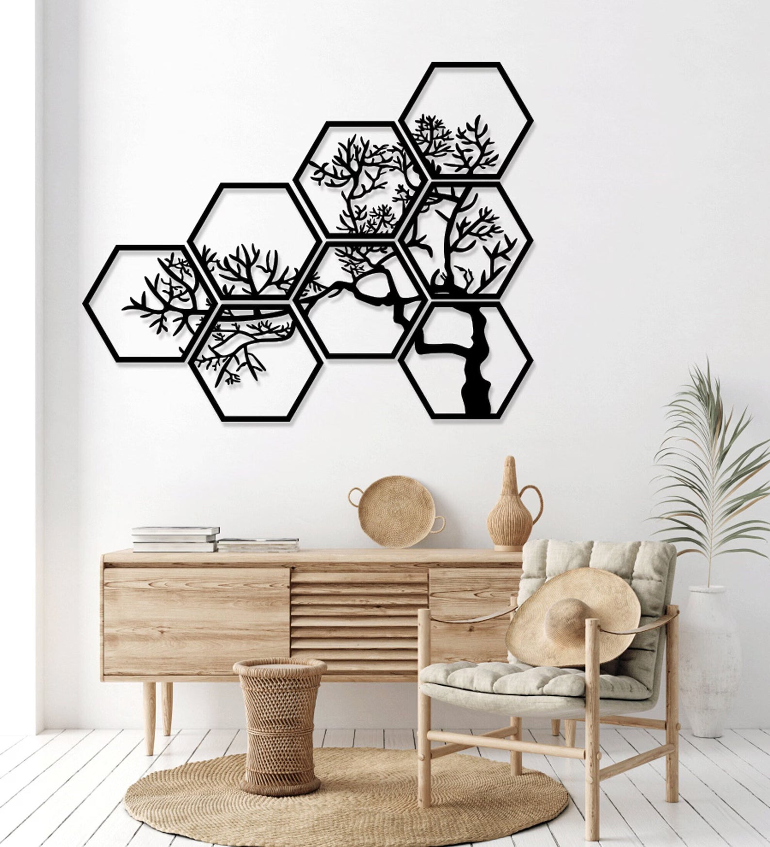 Unesite mir i snagu prirode u svoj dom sa ovim jedinstvenim, modularnim zidnim dekorom. Ovaj set od sedam (ili navedi tačan broj) heksagonalnih panela kombinuje apstraktni dizajn i siluetu drveća, stvarajući zadivljujuću kompoziciju koja se savršeno uklapa u moderne i minimalističke enterijere.