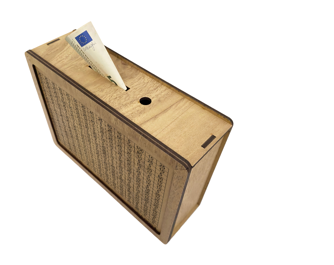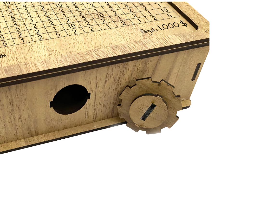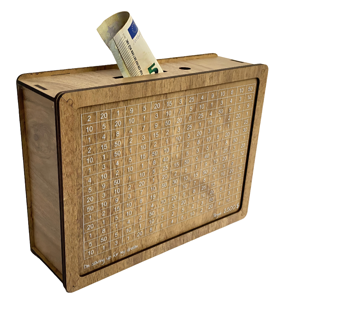 Ova unikatna drvena kasica za novac nije obična kasica – ona je motivacioni izazov za štednju! 🪵✨ Na prednjoj strani nalazi se tabela sa iznosima koje postepeno popunjavaš, a svaki ubaceni novčić ili novčanica te korak bliže tvom cilju 🚀