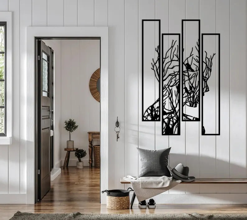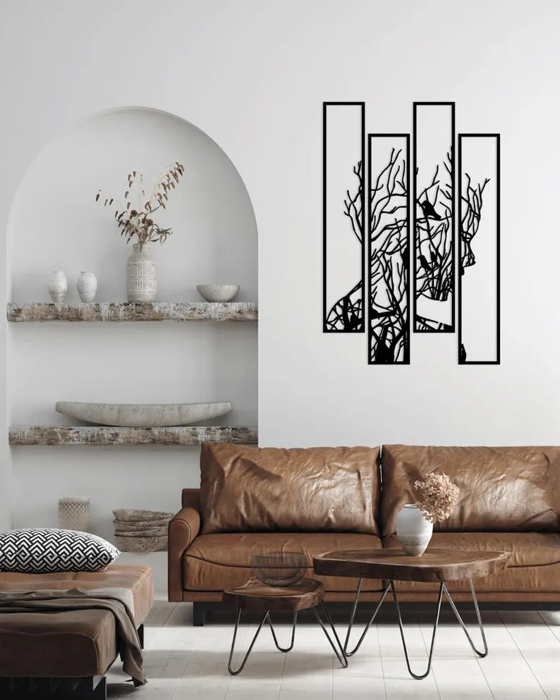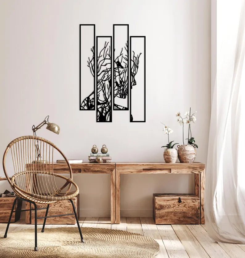 Unesite mir prirode i sofisticiranost moderne umetnosti u svoj prostor. Ova unikatna četvorodelna dekoracija prikazuje preplitanje ljudske siluete i šumskih grana, simbolizujući neraskidivu vezu čoveka i prirode.